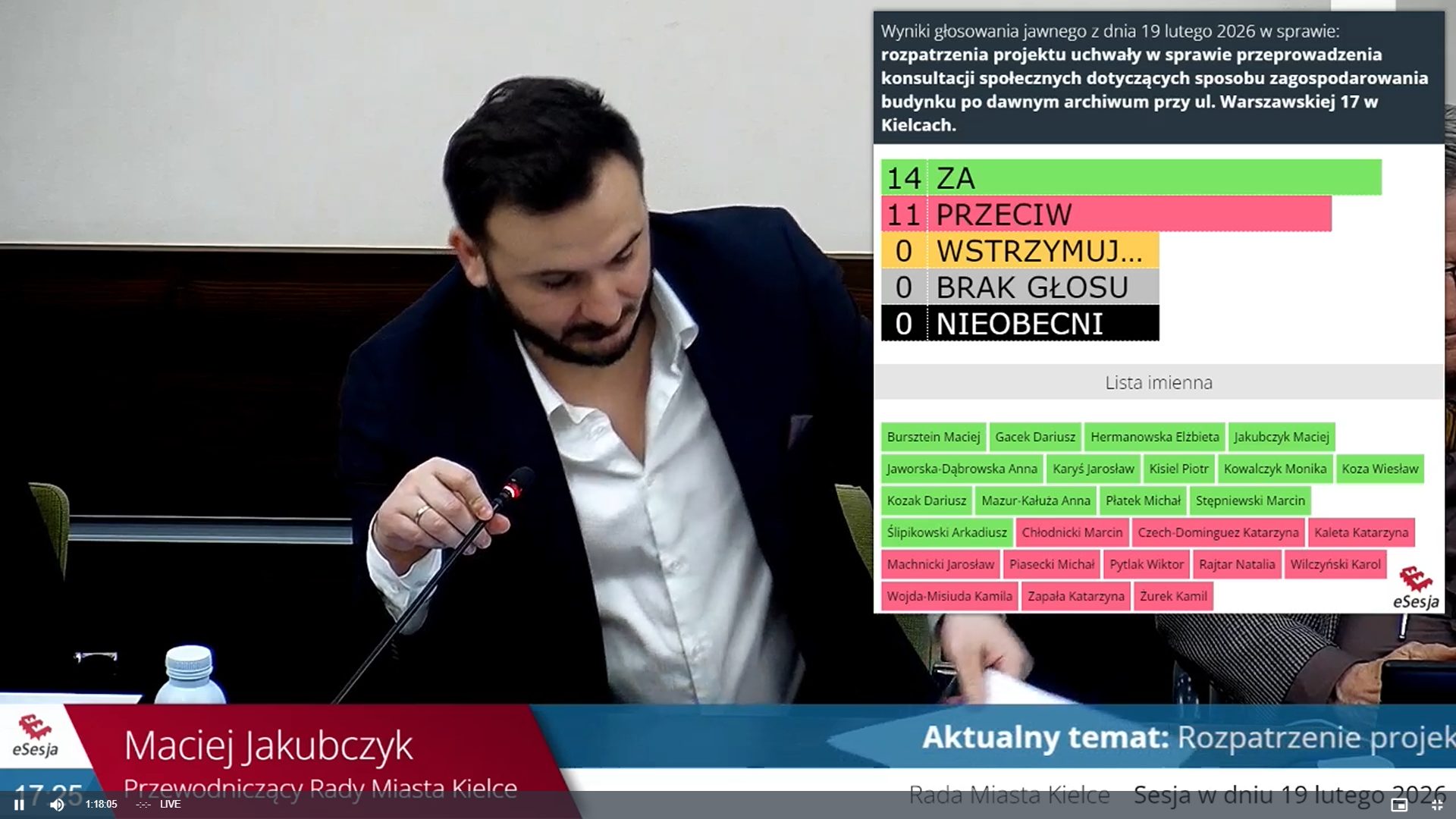 Ostatecznie na sesji z czwartku 19 lutego 14 radnych zgodziło się na „projekt uchwały w sprawie przeprowadzenia konsultacji społecznych dotyczących sposobu zagospodarowania budynku po dawnym archiwum przy ul. Warszawskiej 17 w Kielcach”. „Za” opowiedział się klub PiS i klub Perspektywy, a także radni niezrzeszeni – przewodniczący Rady Miasta Maciej Jakubczyk oraz Monika Kowalczyk. Przeciw zagłosowało 12 osób. Był to klub KO i radna niezrzeszona Natalia Rajtar.