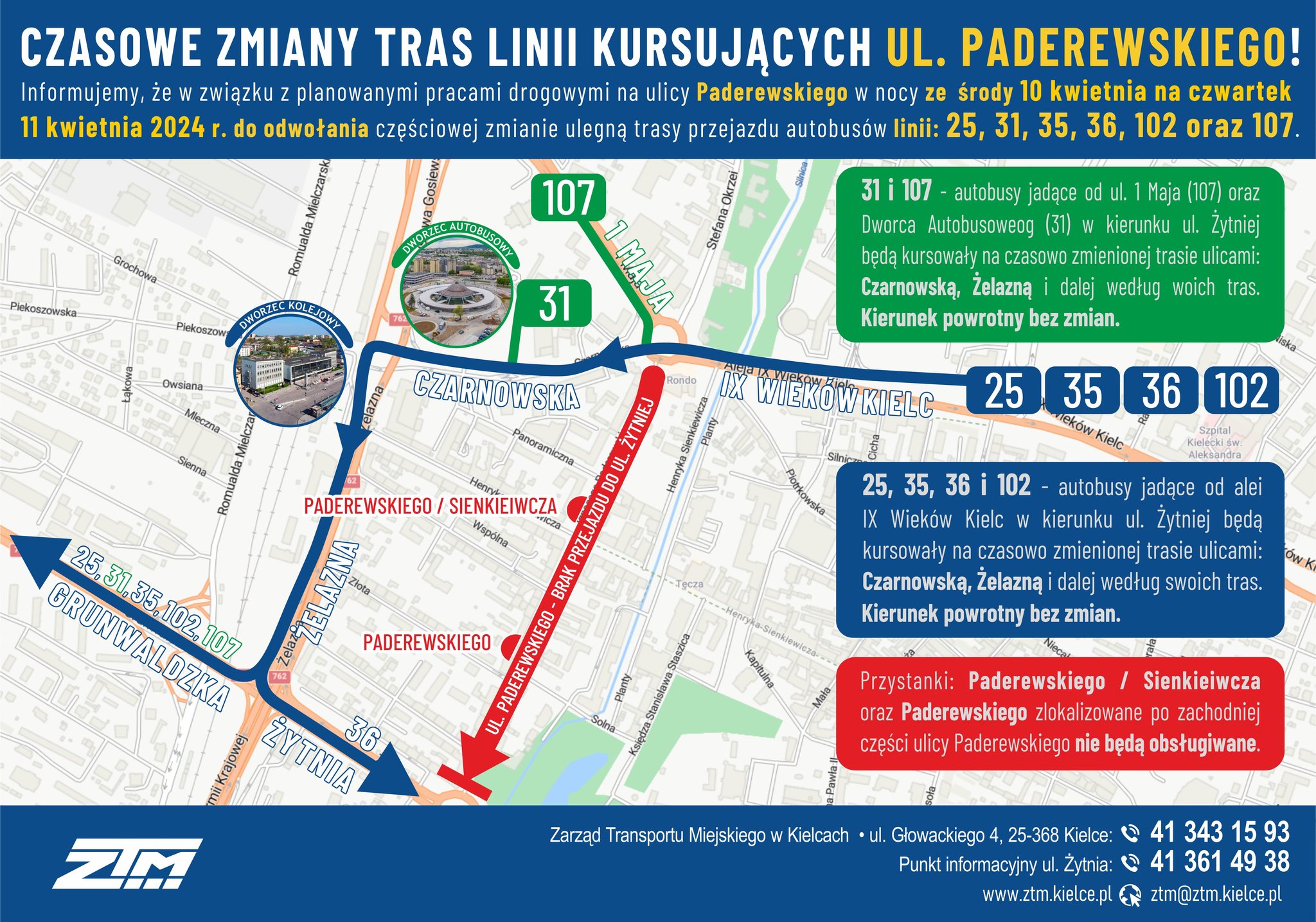Ponadto od czwartku 11 kwietnia 2024 roku dla autobusów linii 25, 31, 35, 102 i 107 jadących od Ronda Herlinga-Grudzińskiego w kierunku ulicy Żytniej zostaje czasowo (do odwołania) zmieniona trasa przejazdu oraz godziny odjazdów. Będą kursowały ulicami Czarnowską, Żelazną i dalej według właściwej trasy przez Grunwaldzką. Nie będą obsługiwały przystanków przy Paderewskiego oraz Żytniej. Natomiast autobusy linii 36 będą kursowały ulicami Czarnowską, Żelazną, Żytnią i dalej według właściwej trasy przez Kaczmarka.