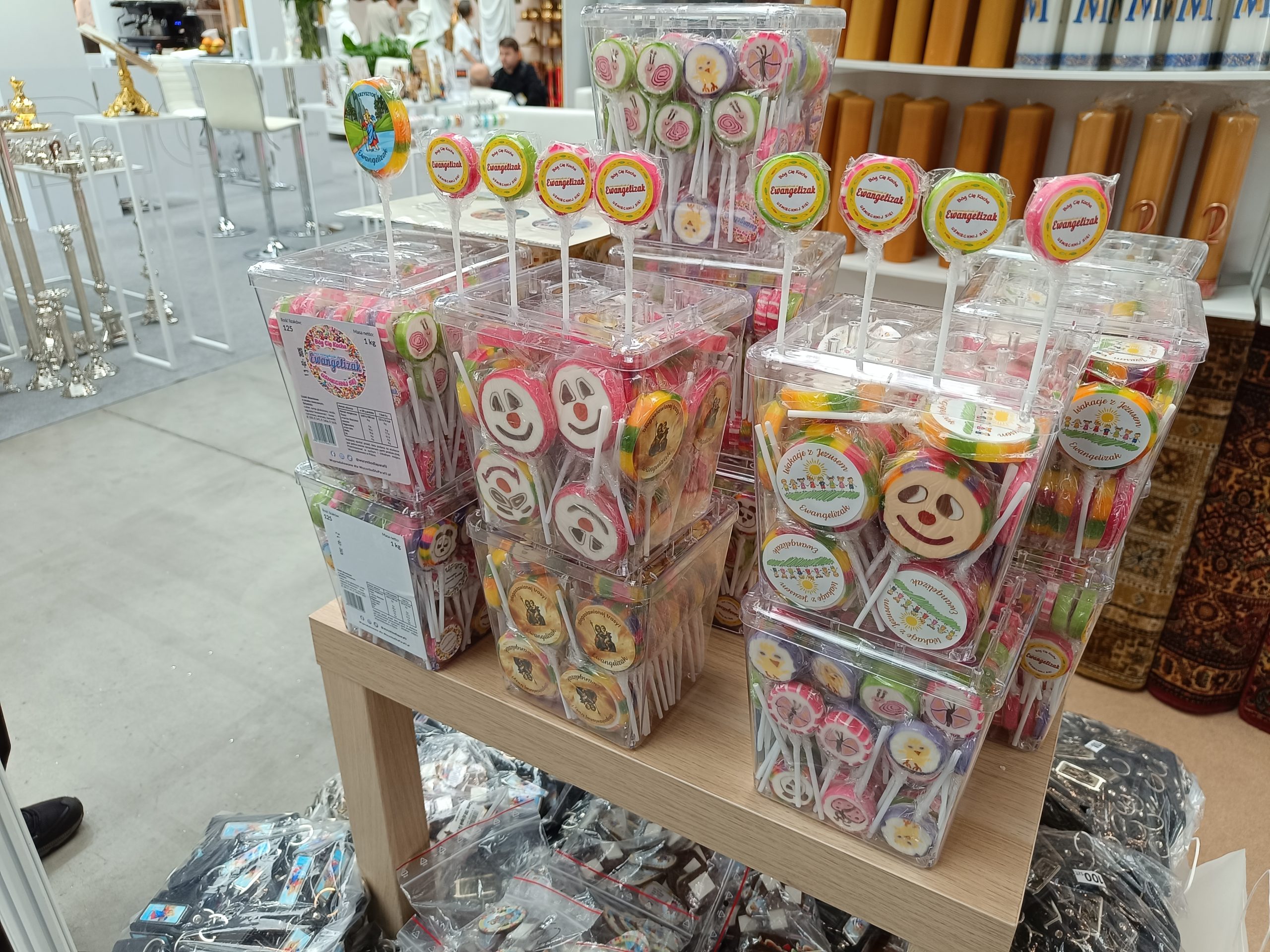 Podchodząc pod stoisko „WszystkoDlaParafii.pl” można otrzymać Ewangelizaka. – Nazwa dosyć ciekawa, wymyśliliśmy ją rok temu i opatentowaliśmy. To coś nowego, bo krówki robią wszyscy, sami też je mamy w ofercie. Ewangelizaki to coś nowego, odbiorcy tego produktu są różni. Księża kupują i rozdają dzieciom, bo to coś słodkiego, fajnego, z uśmiechem. Z prostym, ewangelicznym przesłaniem (na lizaku, który otrzymałem, jest napis „Bóg Cię Kocha” oraz „Uśmiechnij Się” – dop.red.) – mówi Tomasz Wróbel, założyciel firmy.