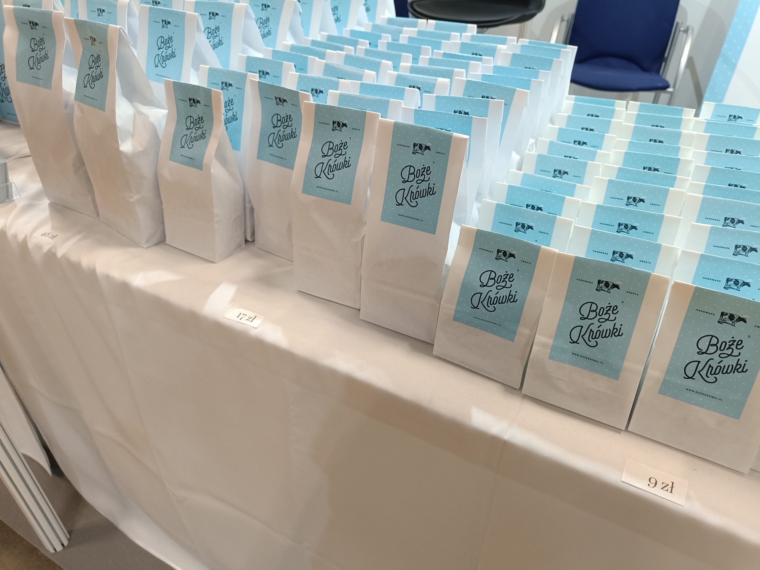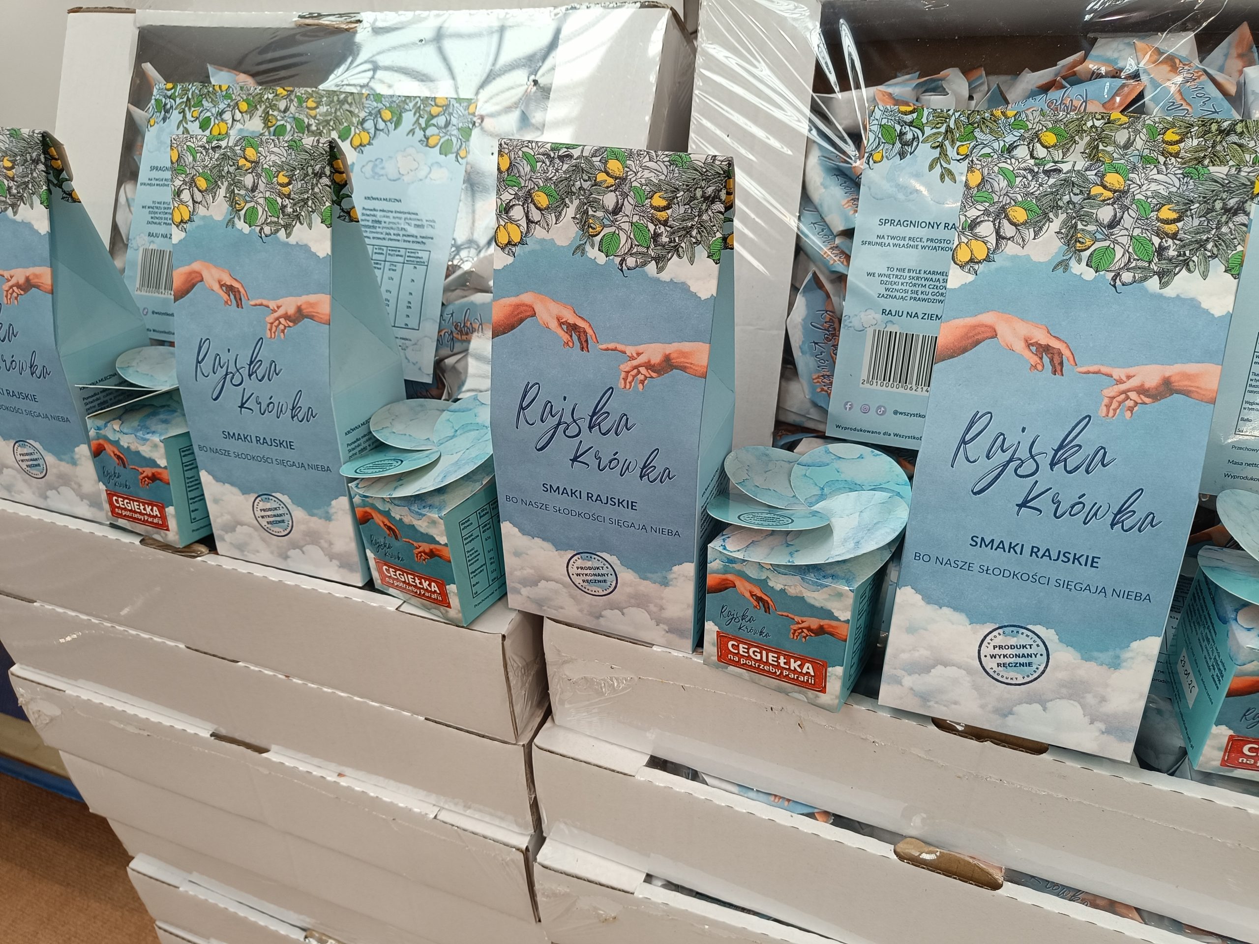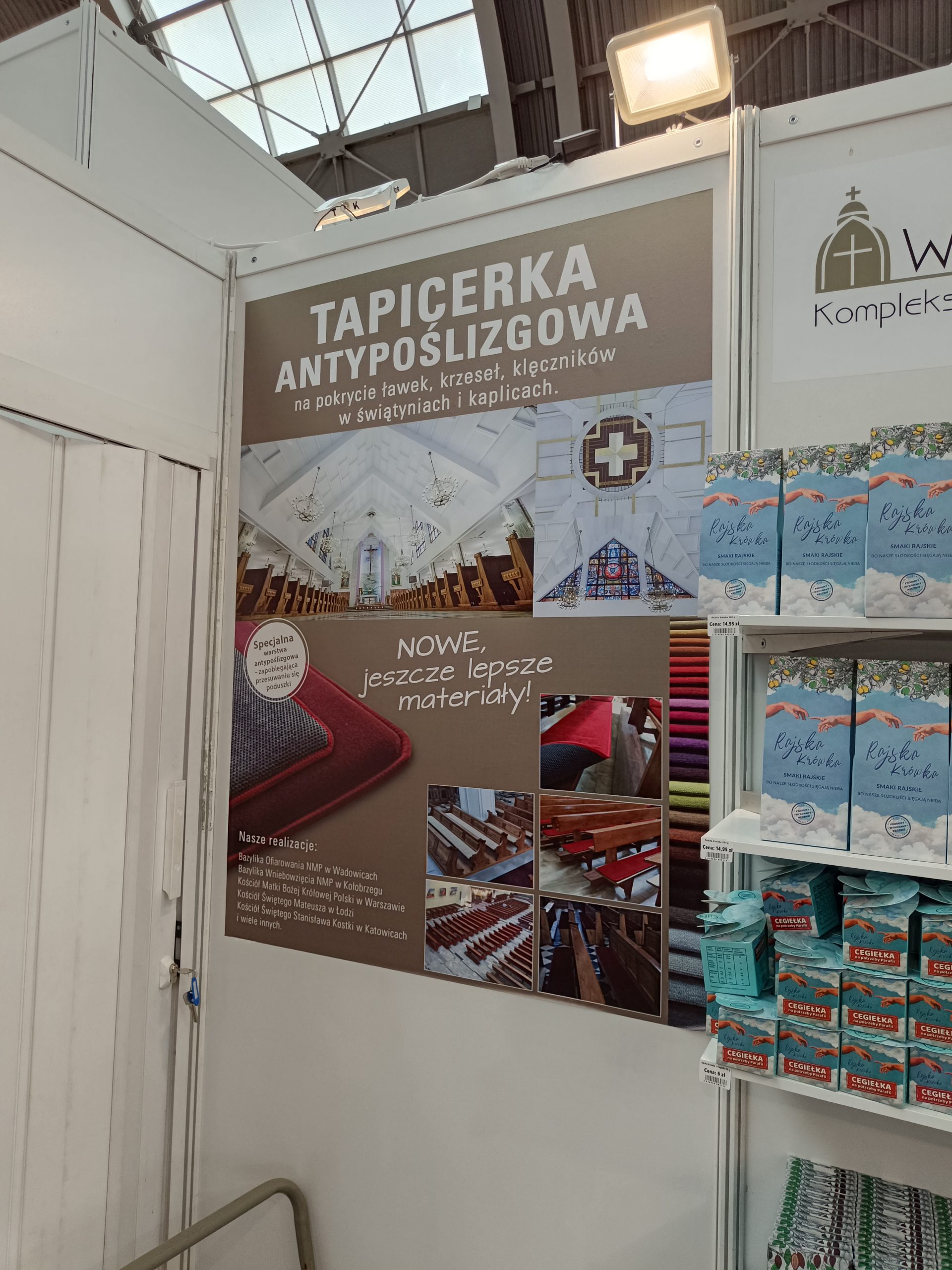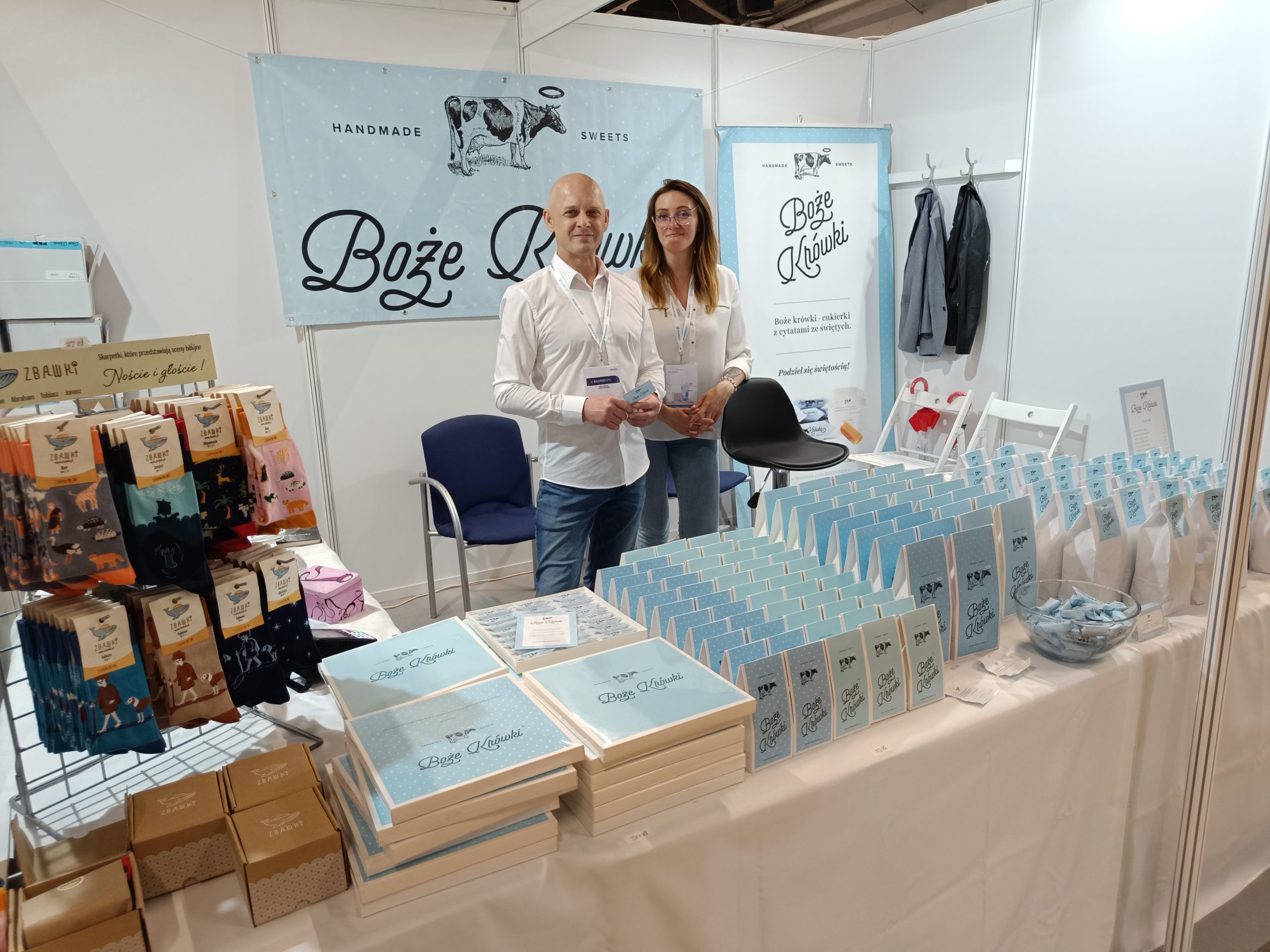 Na Sacroexpo znajdziemy też Boże Krówki. – Na wewnętrznej stronie papierka znajdziemy cytaty świętych. Poza tym oferujemy też skarpetki Zbawki, które przedstawiają sceny biblijne, różne rozmiary. Wszystko można kupić poprzez naszą stronę internetową bozekrowki.pl, a także przez Allegro i w różnych sklepikach z dewocjonaliami, pamiątkami – mówi Krzysztof z Boże Krówki.