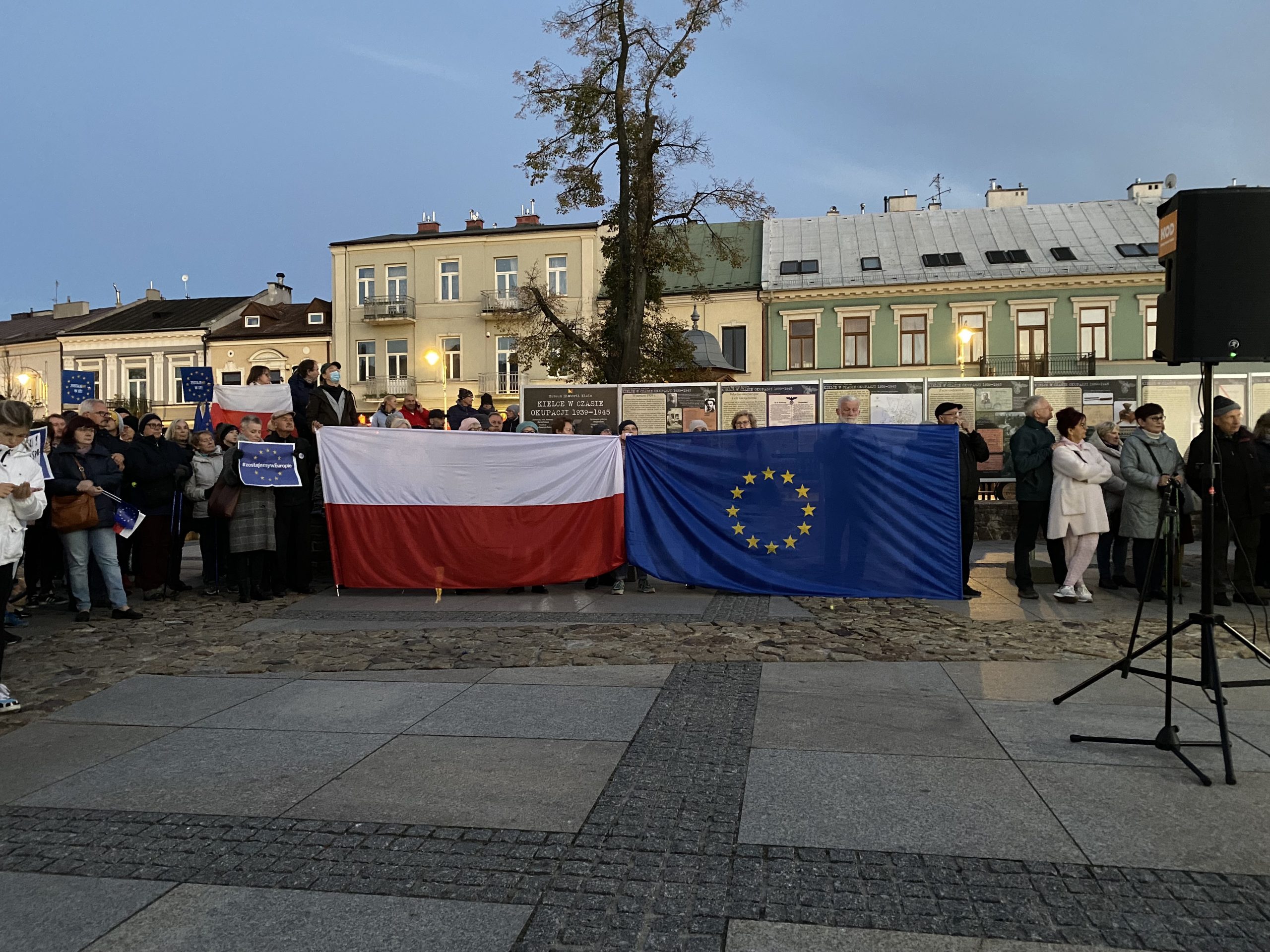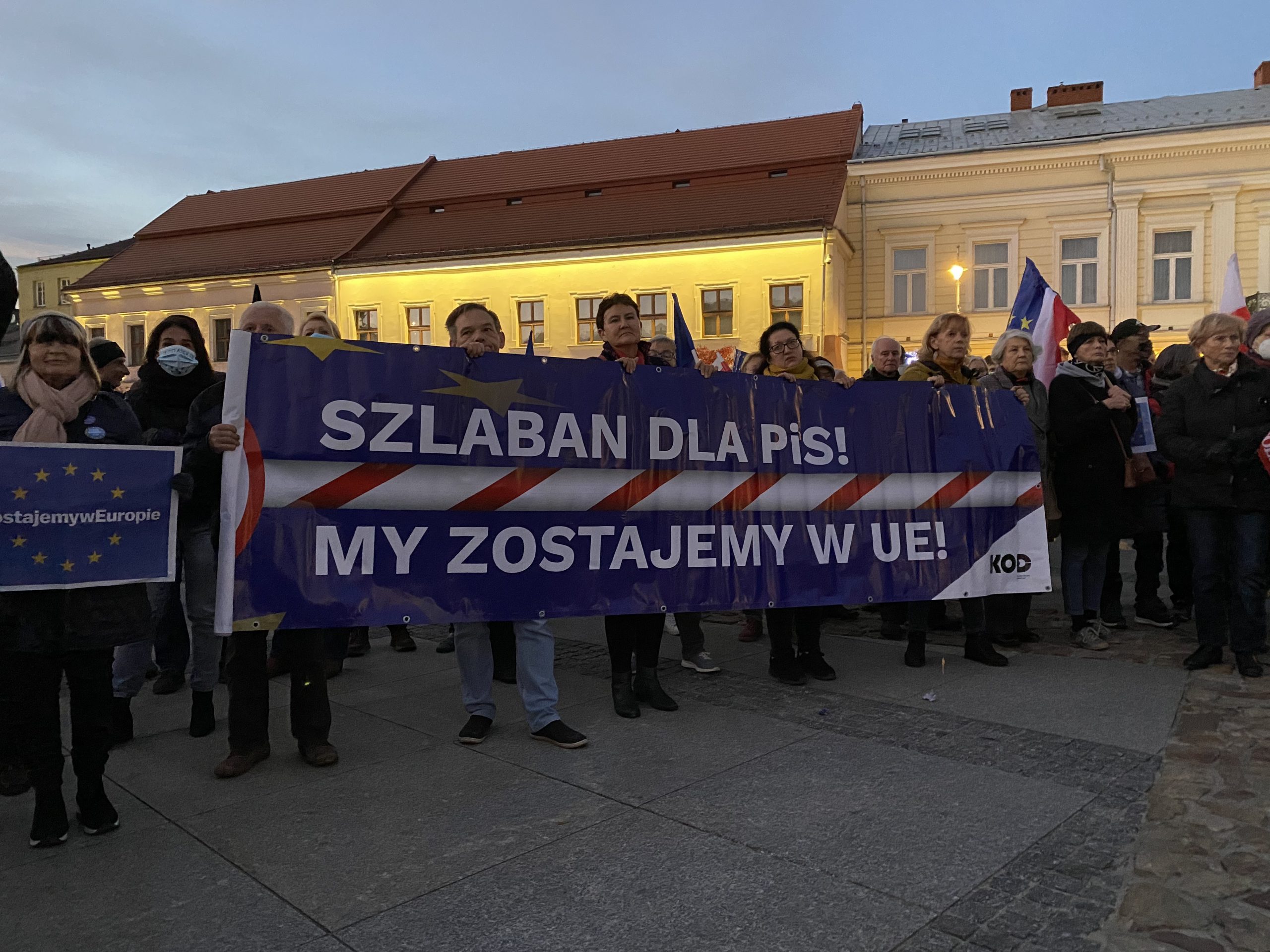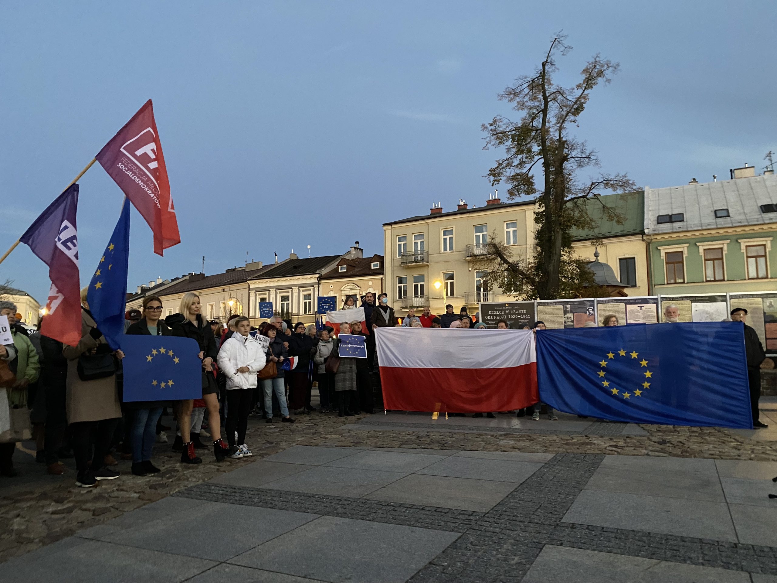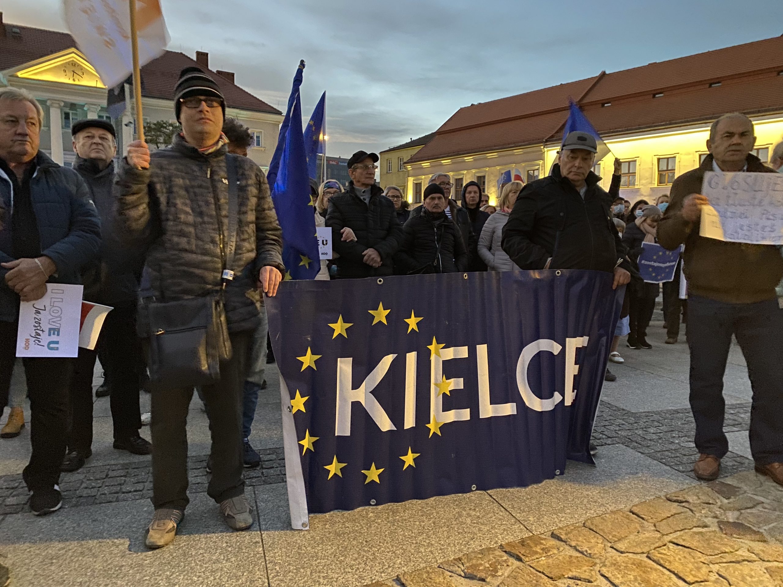 Około tysiąc osób wzięło udział w demonstracji pod hasłem „My zostajemy w UE, rząd wychodzi” na kieleckim Rynku. Wśród protestujących byli działacze partii opozycyjnych: Adam Jarubas, Artur Gierada, Agata Wojda, Marcin Chłodnicki oraz prezydent Kielc, Bogdan Wenta.  Protesty mają związek z ostatnim wyrokiem Trybunału Konstytucyjnego, który orzekł, że polski rząd nie musi respektować unijnych przepisów, uznając wyższość prawa krajowego.