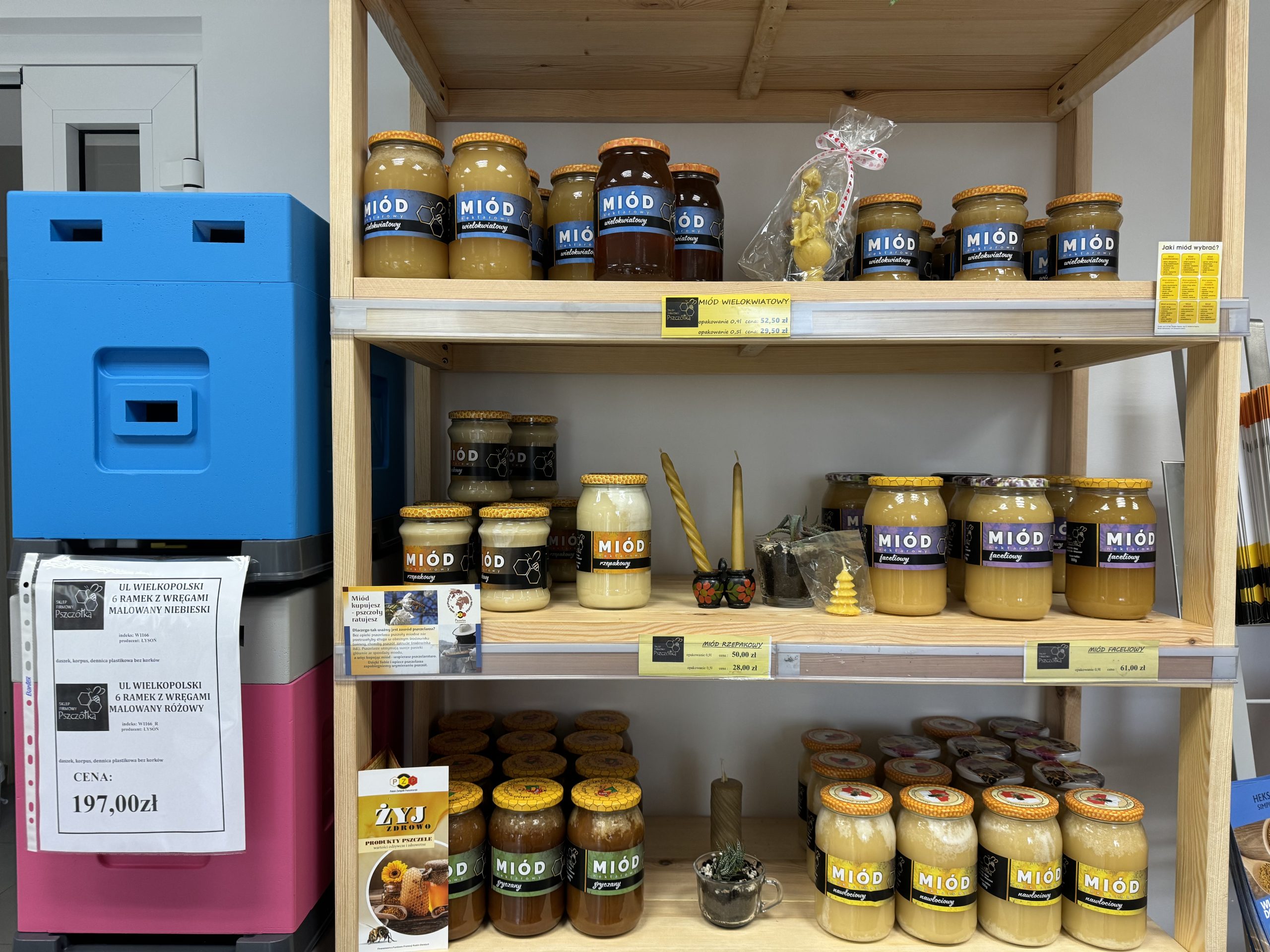 Sklep firmowy „Pszczółka” to prawdziwa kraina miodu. Na miejscu możemy zakupić kilkanaście rodzajów tego słodkiego produktu, między innymi wielokwiatowy, rzepakowy, faceliowy, nawłociowy, gryczany czy ze spadzi iglastej.