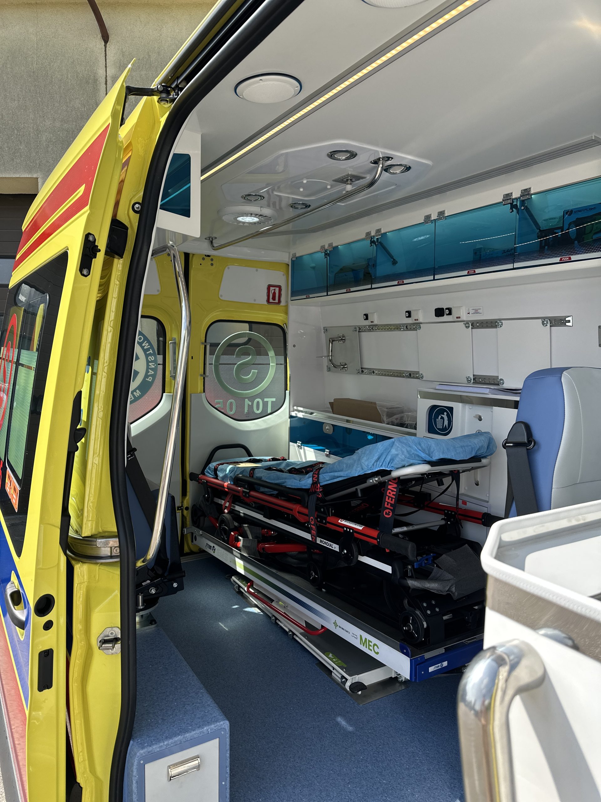 Każdy z ambulansów wyposażony jest w profesjonalne nosze z transporterem oraz defibrylator transportowy, co pozwala ratownikom jeszcze skuteczniej nieść pomoc osobom w stanie zagrożenia życia.