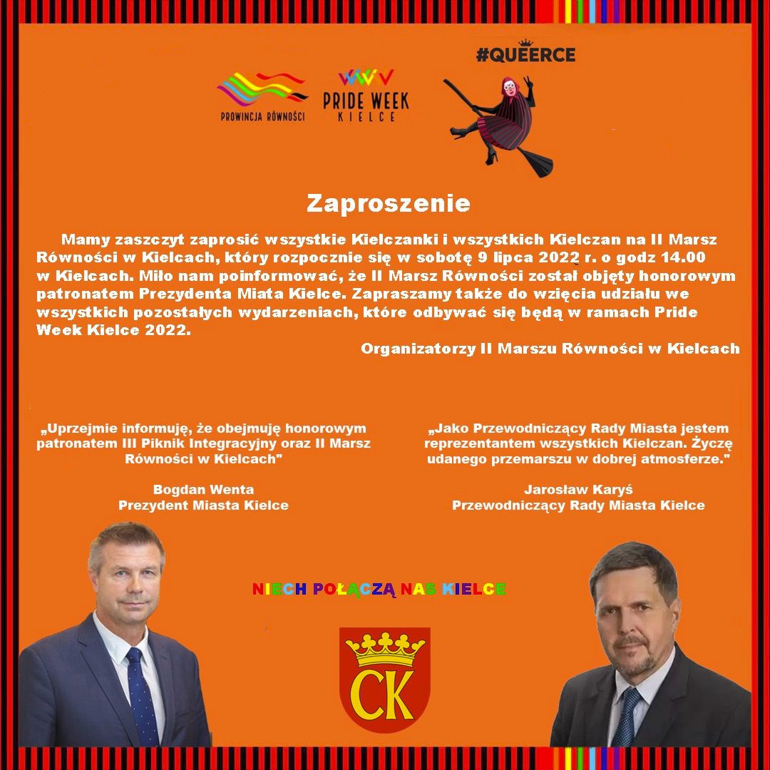 W poniedziałek do kilku instytucji w Kielcach trafiły zaproszenia na marsz równości, który ma odbyć się w stolicy woj. świętokrzyskiego 9 lipca. Na zaproszeniu umieszczono wizerunki przewodniczącego rady miasta Jarosława Karysia (szef klubu PiS) i prezydenta Kielc Bogdana Wenty. Żaden z nich nie wyraził na to zgody.