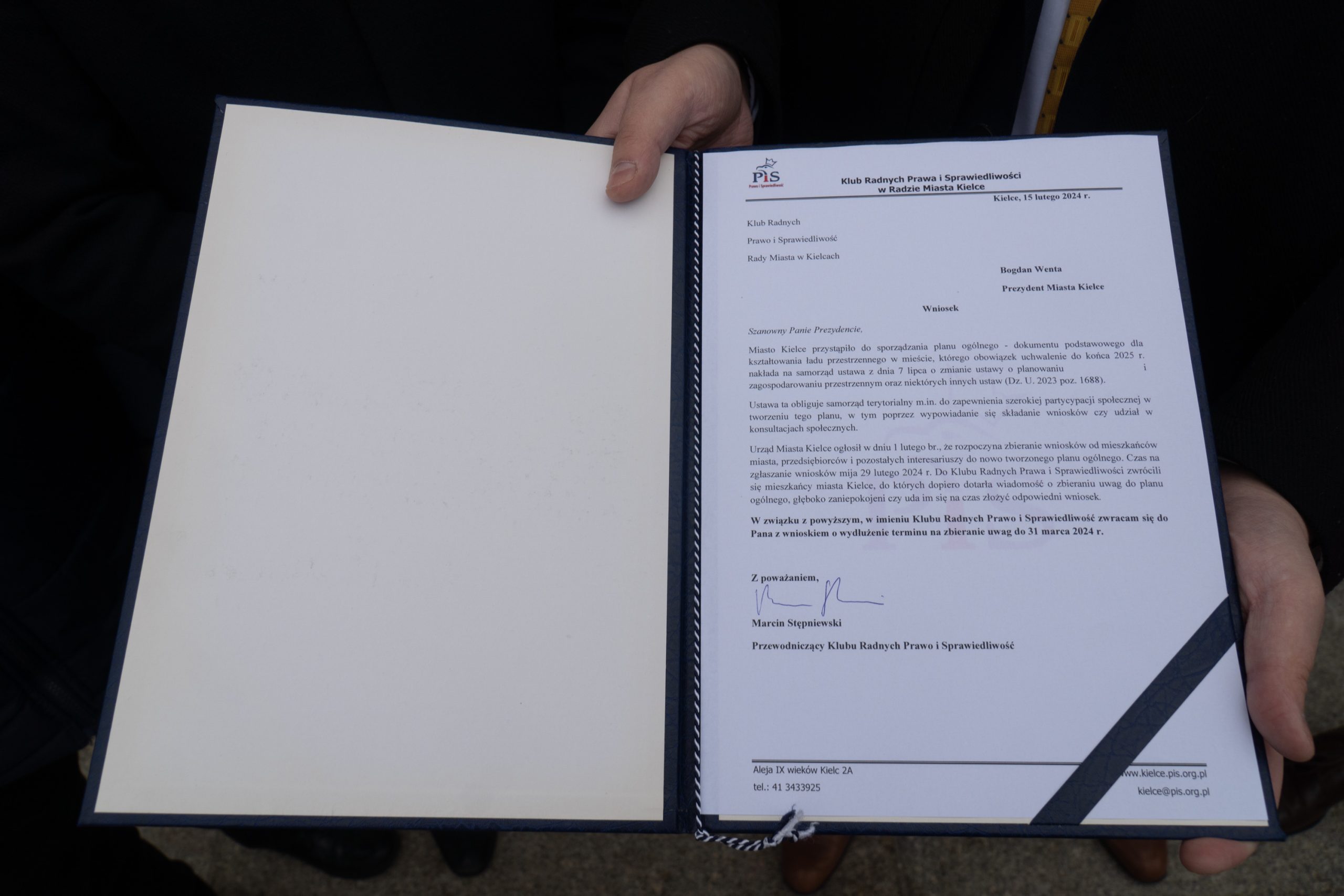 Z dniem 1 lutego 2024 roku w Kielcach rozpoczął się proces zbierania wniosków do planu ogólnego miasta. Władze wyznaczyły termin składania uwag do 29 lutego. Radni Prawa i Sprawiedliwości z Marcinem Stępniewskim na czele żądają jednak wydłużenia terminu składania uwag o kolejny miesiąc, czyli do końca marca. Działacze podkreślają, że nie wszyscy mieszkańcy Kielc wiedzą, kiedy i w jaki sposób mogą złożyć wnioski i potrzebują na to więcej czasu.
