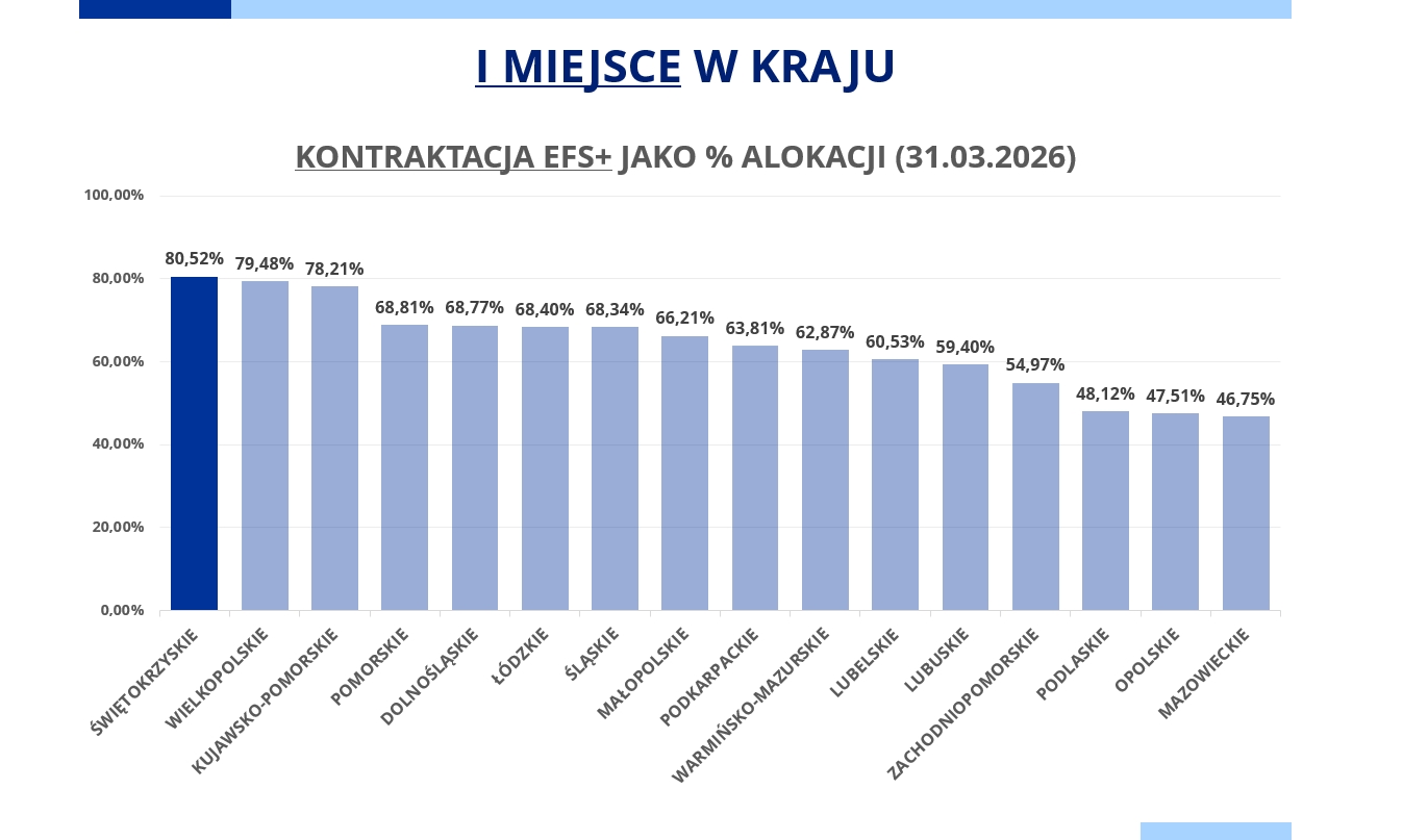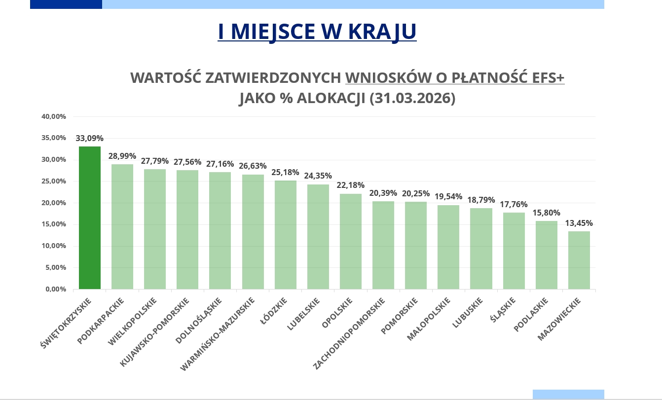 W ramach wdrażania społecznej części programu Fundusze Europejskie dla Świętokrzyskiego województwo świętokrzyskie wysunęło się na pierwsze miejsce wśród regionów. – Szybkie postępowanie w finansowaniu kolejnych przedsięwzięć z Europejskiego Funduszu Społecznego Plus pozwalają zakładać, że jeszcze w tym roku inwestowanie środków z miękkiej części programu regionalnego zostanie praktycznie zakończone – informuje Urząd Marszałkowski.