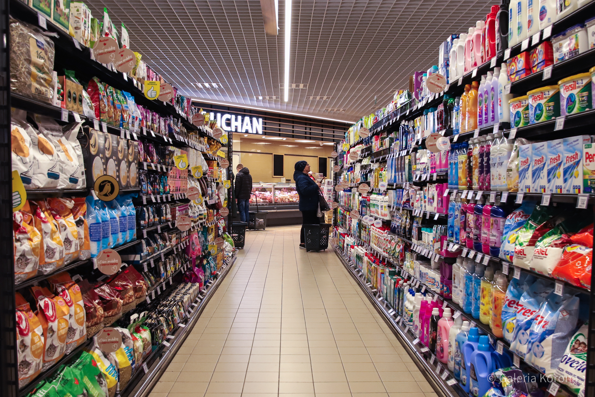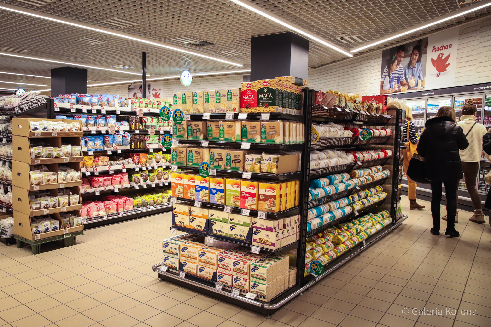 W Galerii Korona w Kielcach przez jakiś czas brakowało supermarketu. Spowodowane to było przygotowywaniem lokalu pod nowy sklep. W galerii otworzył się Auchan. Poprzednio, od 13 lutego 2019 roku działał tam Carrefour. Jeszcze wcześniej, bo od 2010 w tym miejscu funkcjonowały delikatesy „Piotr i Paweł”.
