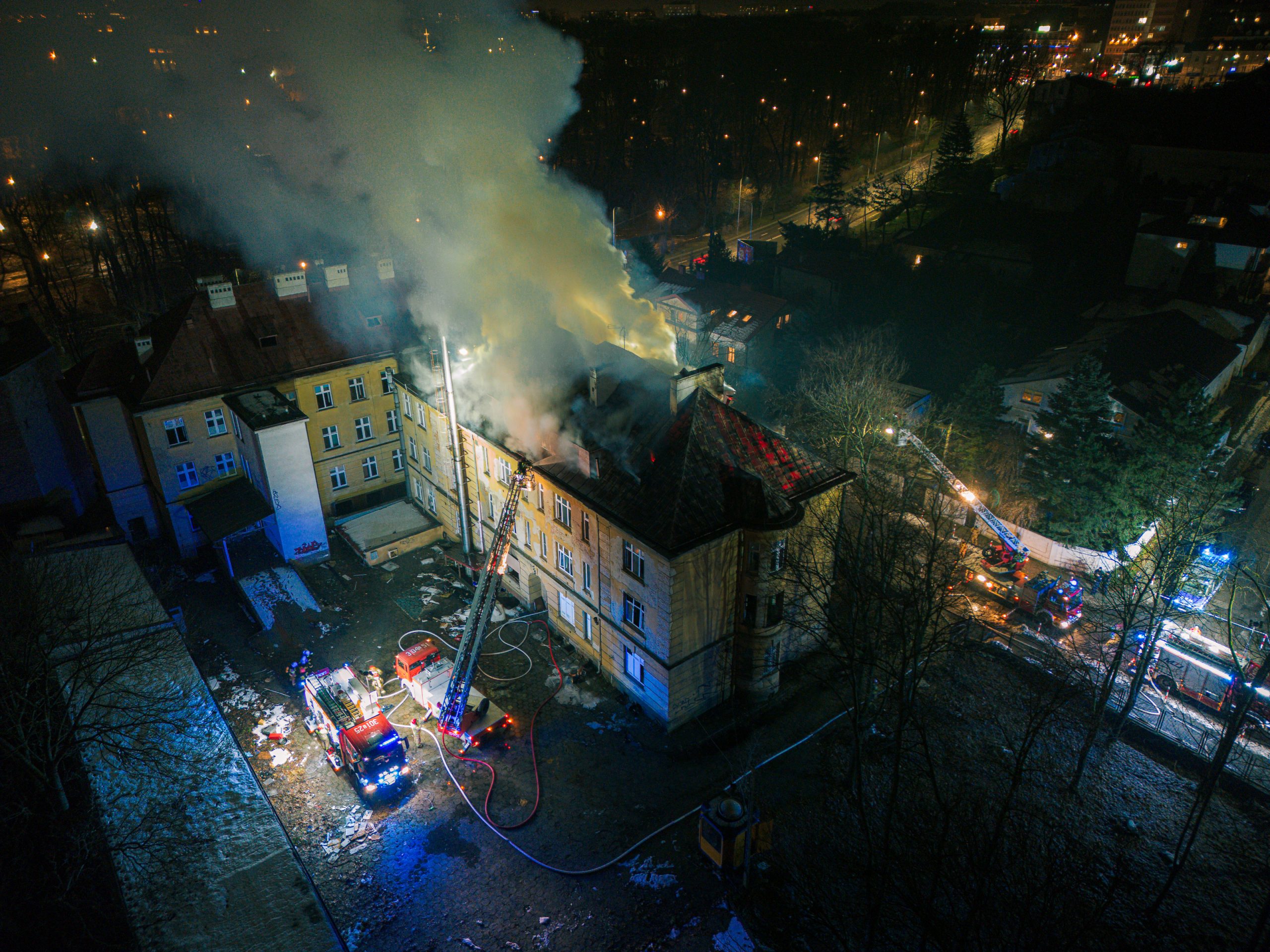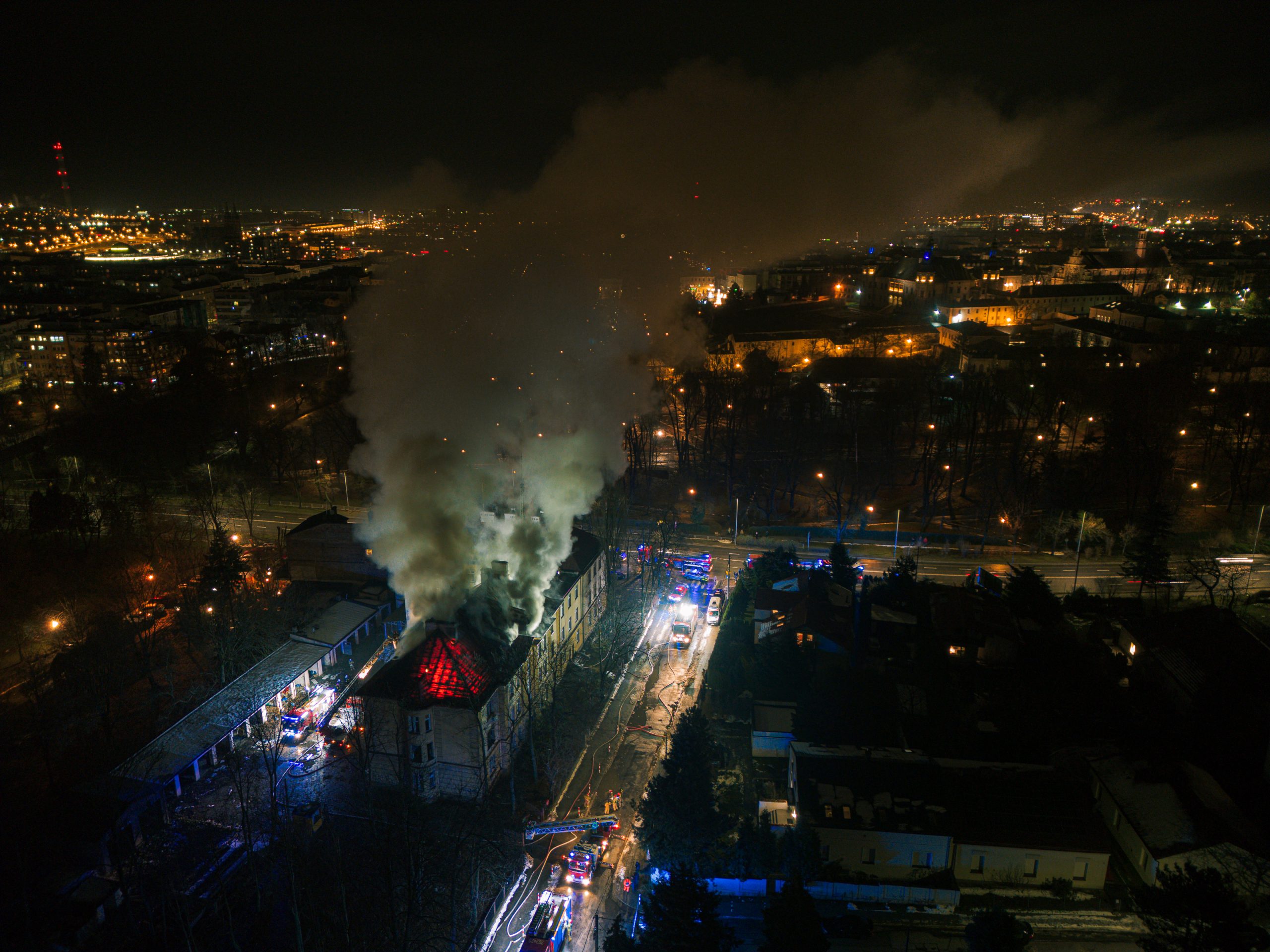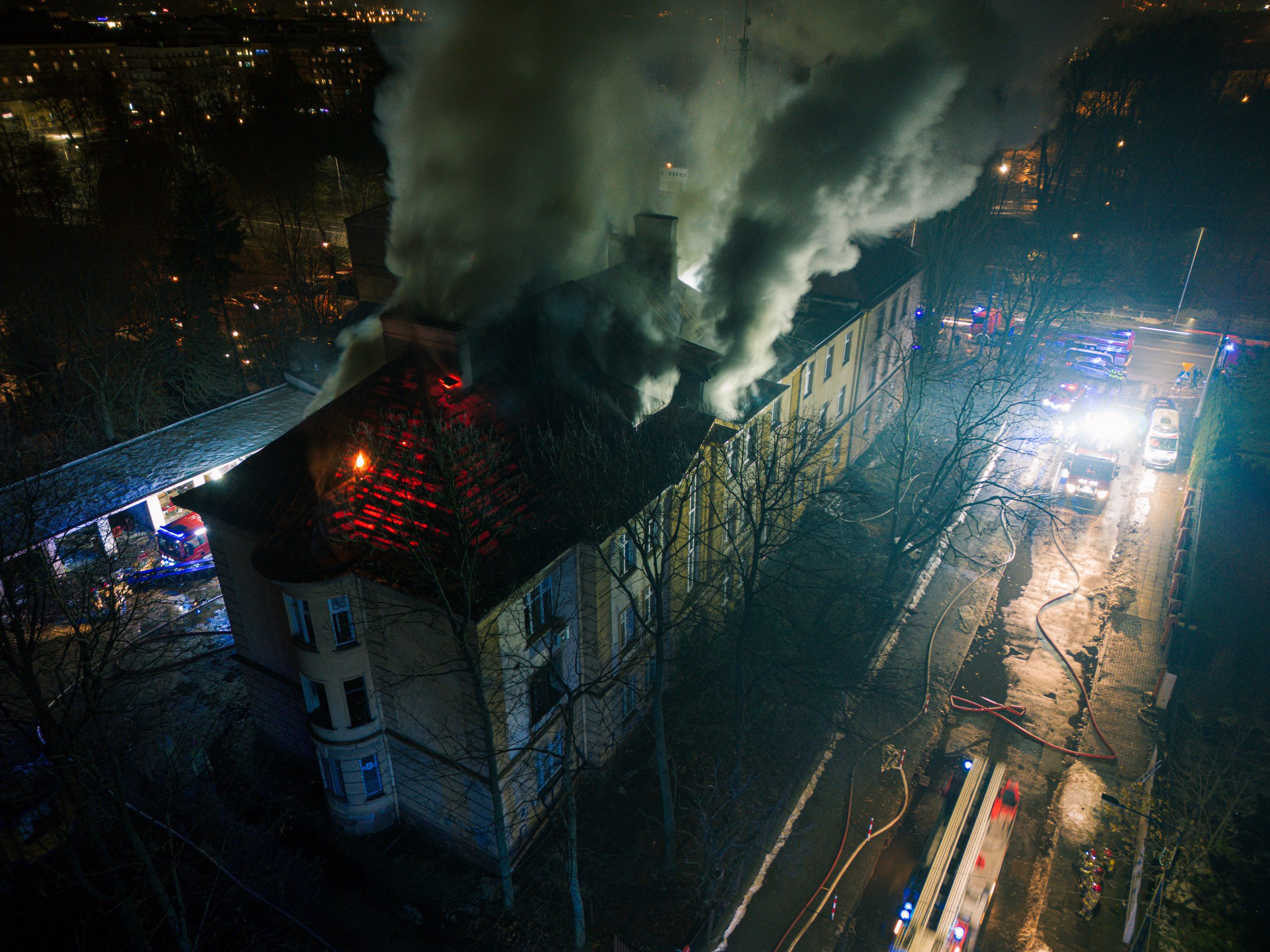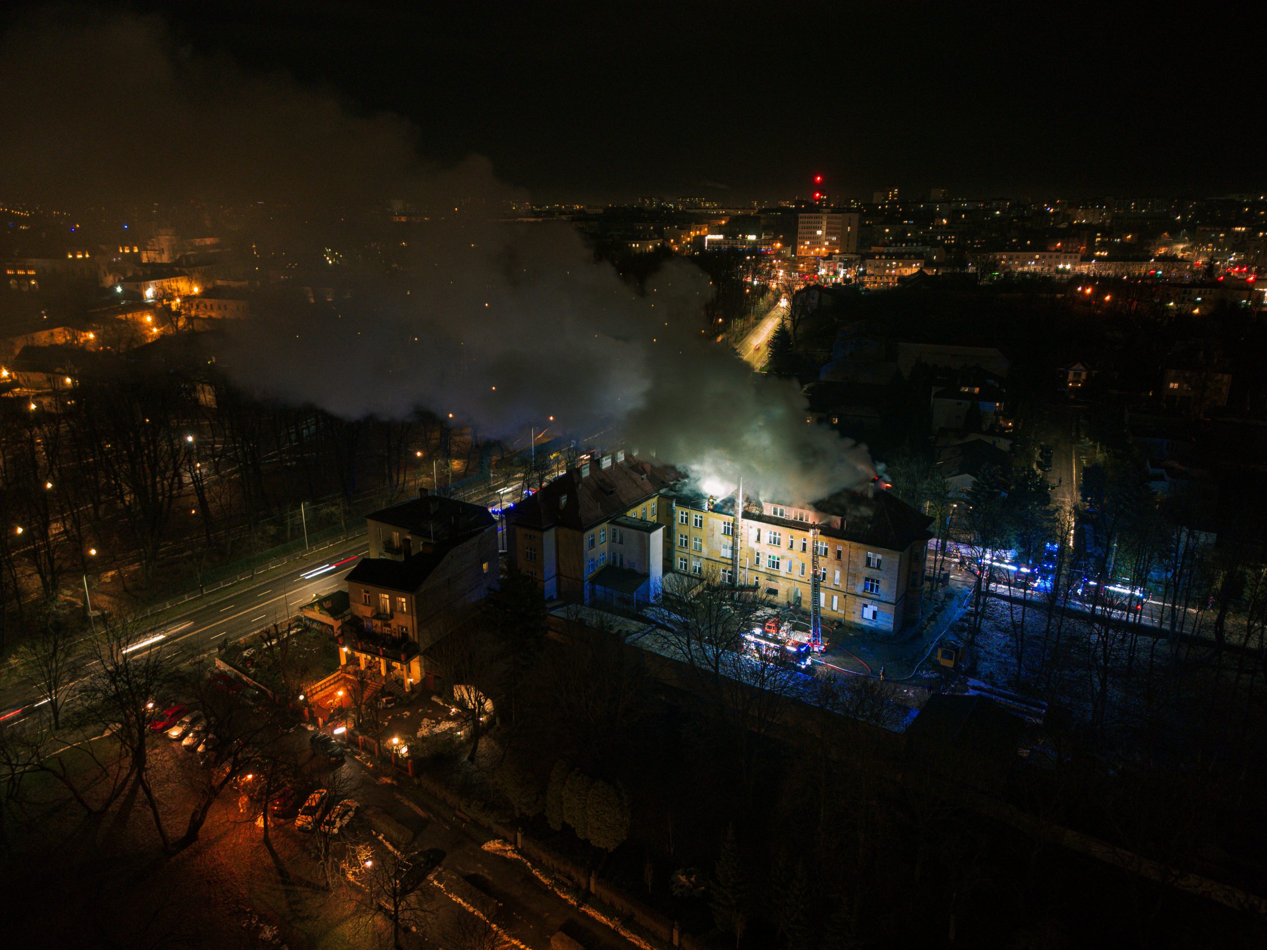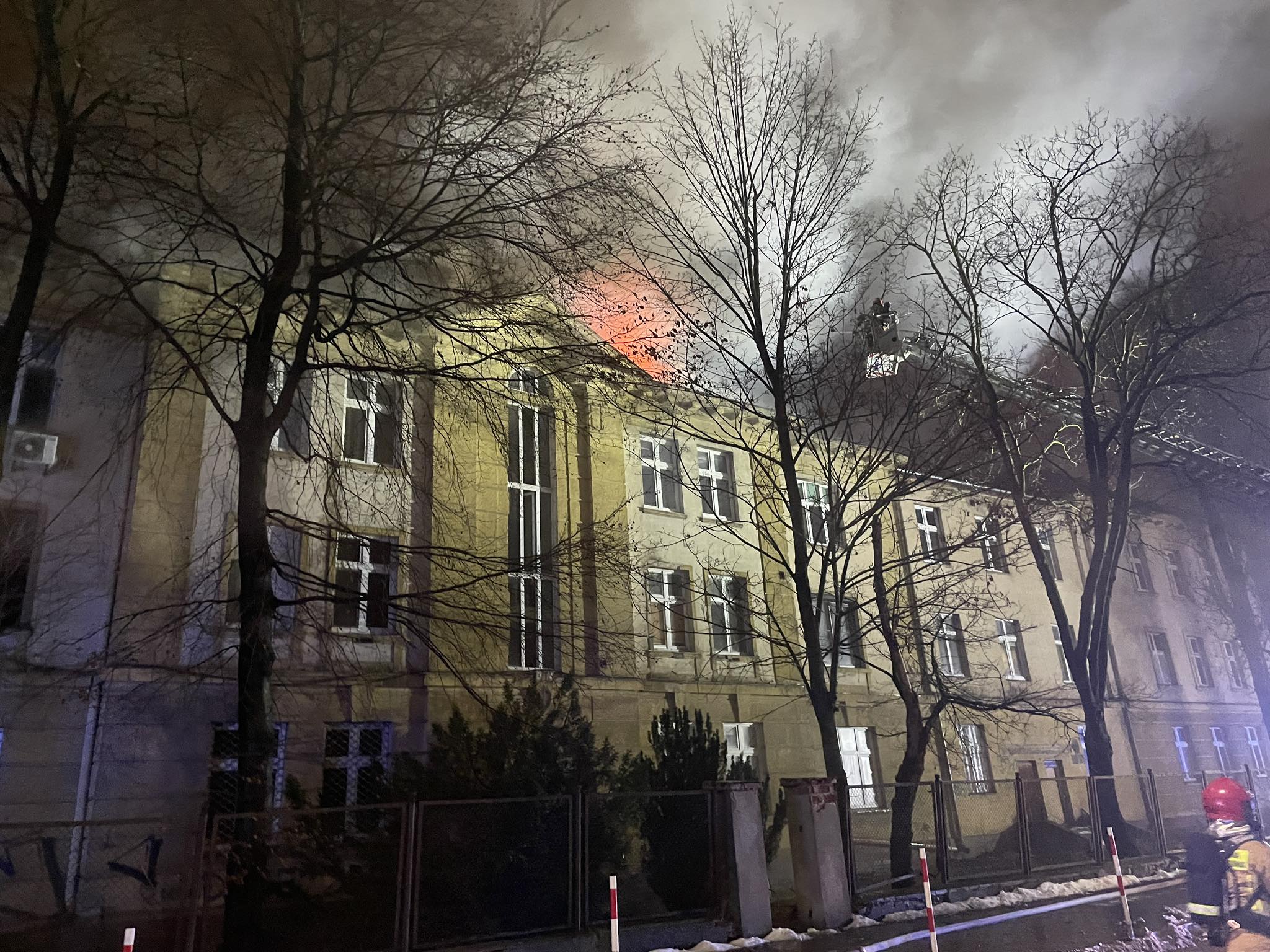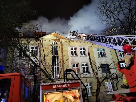 Dodaje, że ogień objął fragment poszycia dachowego dawnego szpitala MSWiA przy ulicy Ogrodowej. Zgłoszenie o zdarzeniu wpłynęło około godziny 17:10, a strażacy zabezpieczyli teren i próbują teraz ugasić pożar. Jak z kolei informuje straż miejska, to ich funkcjonariusze zauważyli podczas patrolu wydobywający się z obiektu dym i wezwali pomoc.
