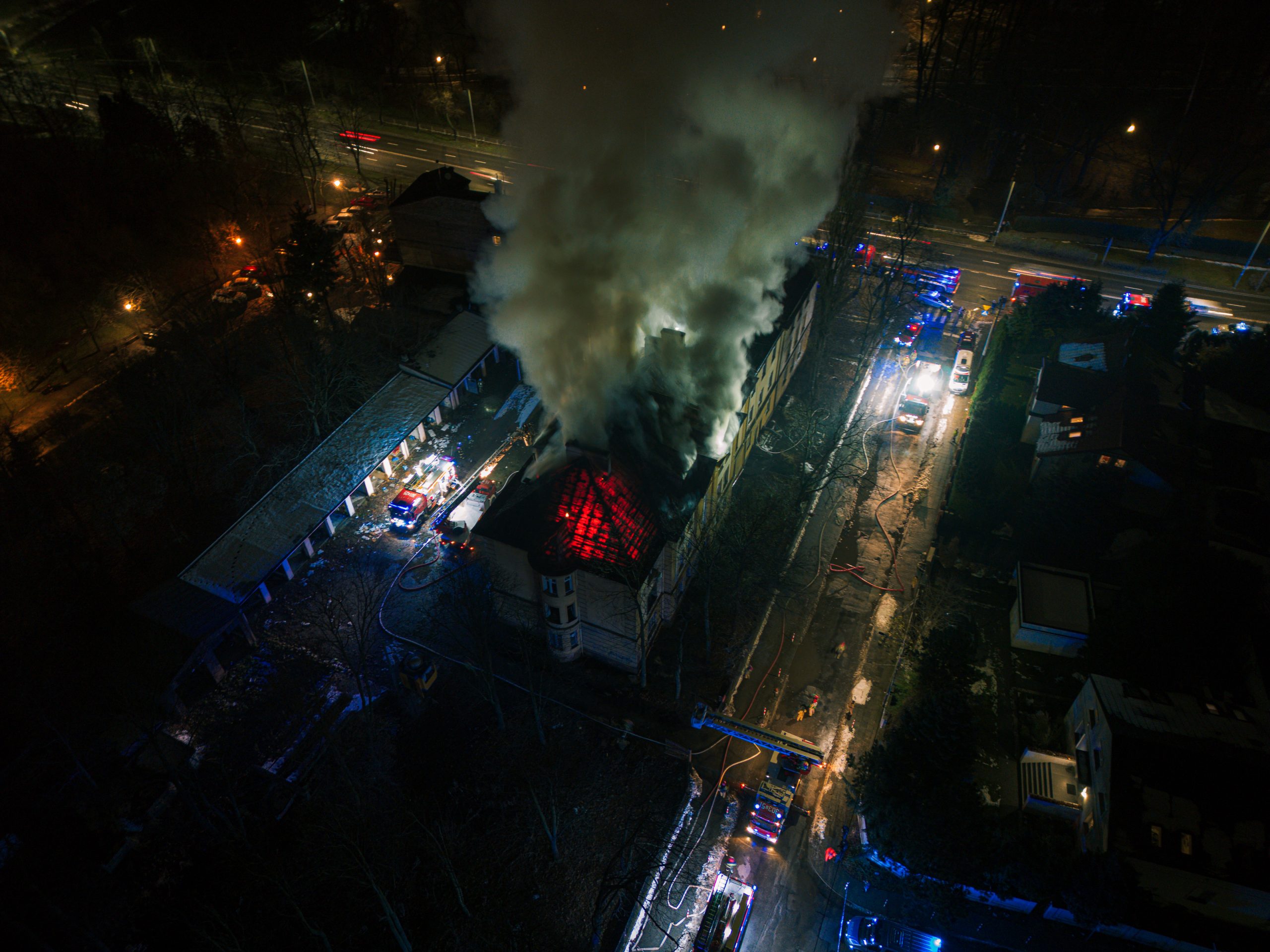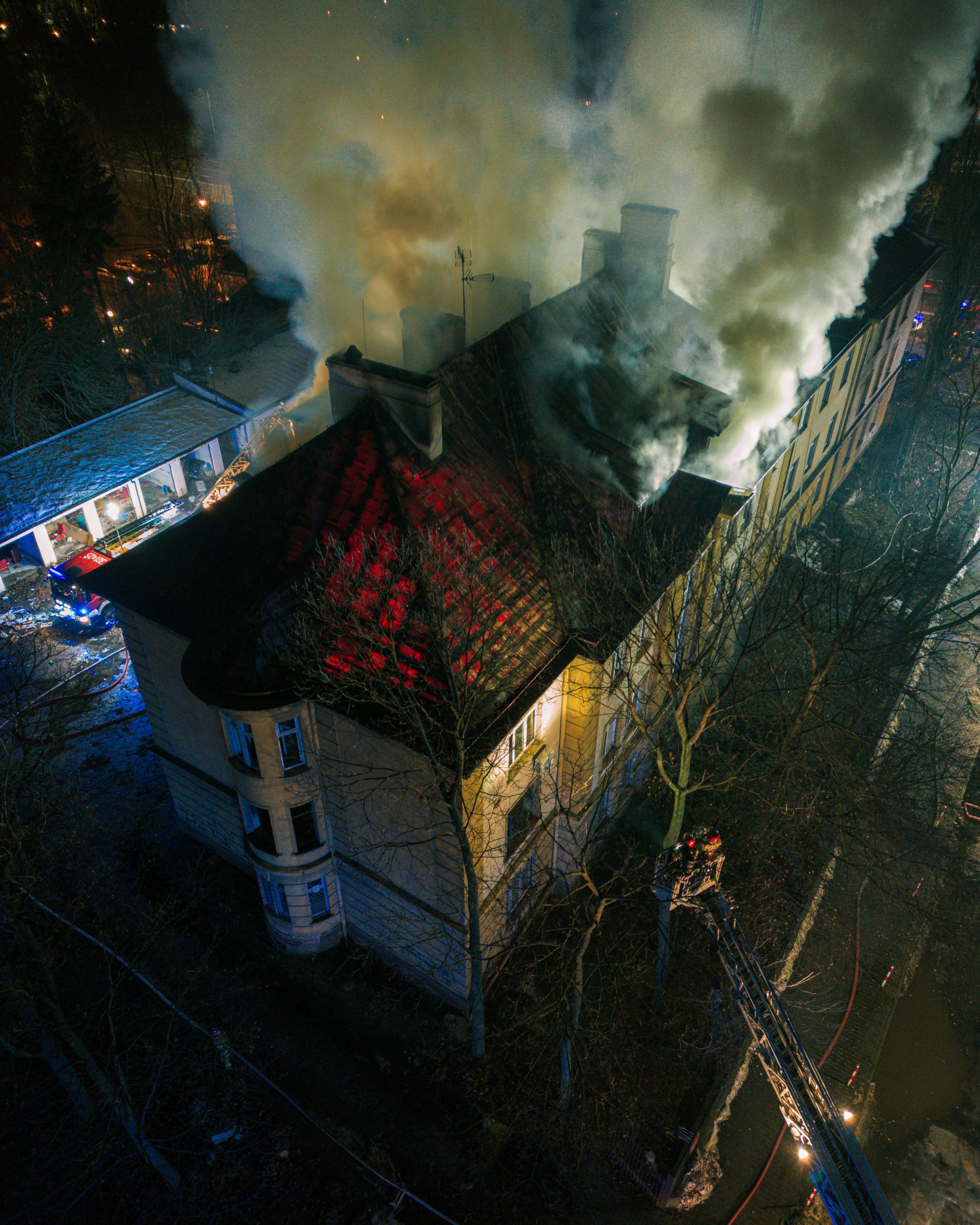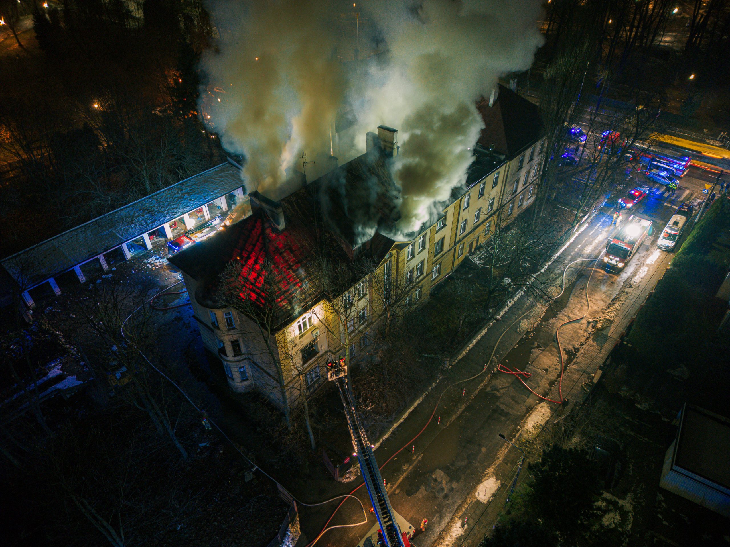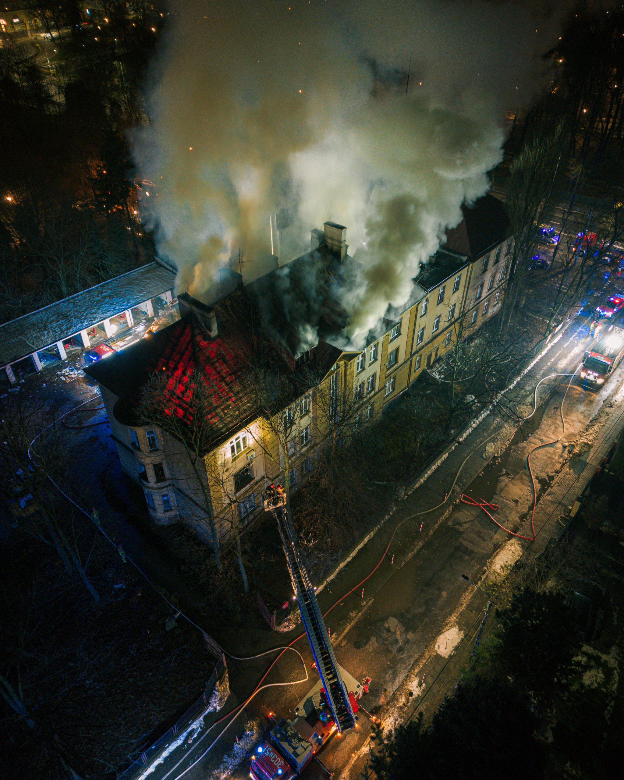 Dodaje, że strażacy nie są w tej chwili w stanie przeszukać budynku. Podawane są dwa prądy wody z zewnątrz, od góry. Kolejny podawany jest przez klatkę schodową. – Dostaliśmy się tylko na klatkę schodową, jednak poddasze wciąż jest nieprzeszukane i źródło pożaru nie zostało jeszcze zlokalizowane – dodaje rzecznik.