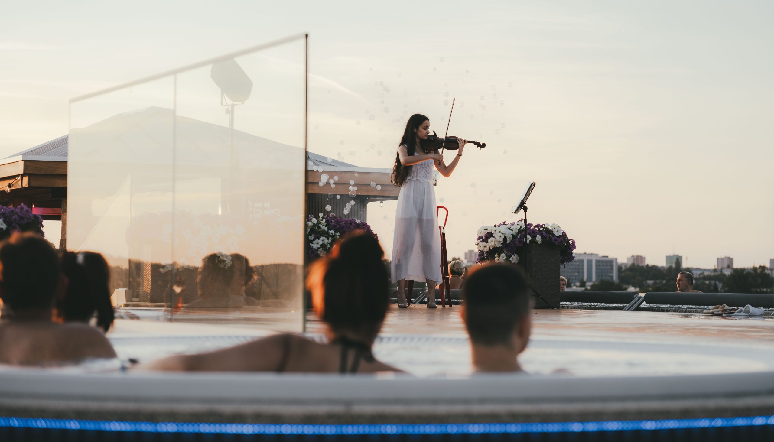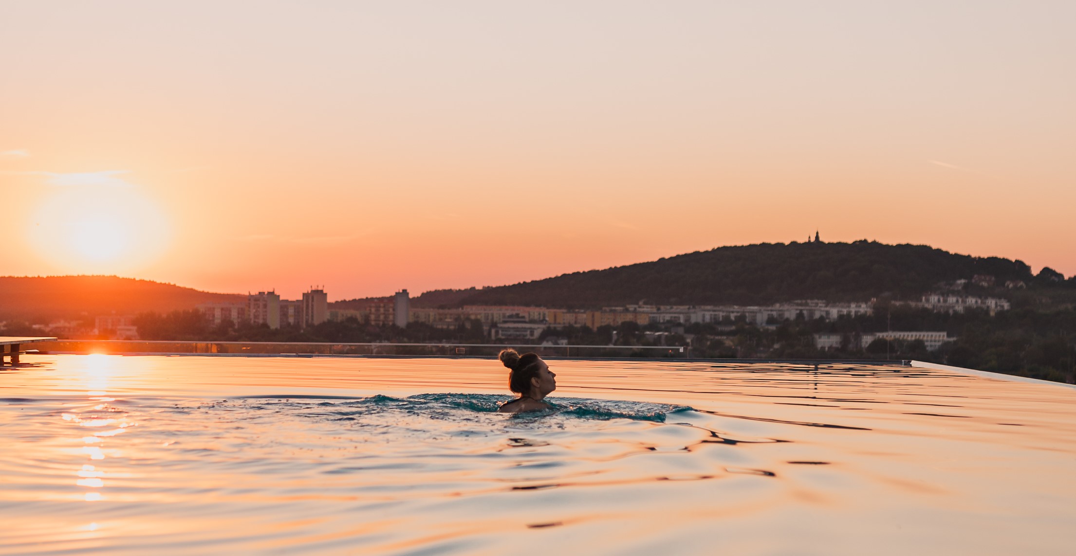 Na gości czekają bajkowe widoki na zachodzące słońce nad Karczówką. Na dachu, nie licząc basenu, znajdują się dwie duże wanny jacuzzi z hydromasażami z widokiem na baseny tropikalne i korony drzew Parku Baranowskiego. Dla gości dostępna została stworzona także strefa wypoczynku z leżakami, kokonami oraz barem serwującym wyśmienite drinki.