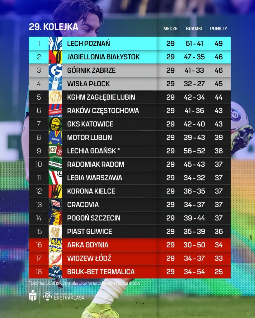 Rozgrywki weszły jednak w decydującą, bardzo nerwową fazę. W ostatniej serii w końcu powstała większa, ale dalej minimalna różnica między siódmym a ósmym miejscem. Tę wyższą zajmuje GKS Katowice i ma cztery punkty przewagi nad Motorem Lublin. Można śmiało powiedzieć, że podopieczni Rafała Góraka są ostatnią drużyną, która ma już zapewnione utrzymanie. Na czele z 49 punktami znajduje się Lech Poznań, który ma tylko trzy „oczka” przewagi nad Jagiellonią Białystok i Górnikiem Zabrze.