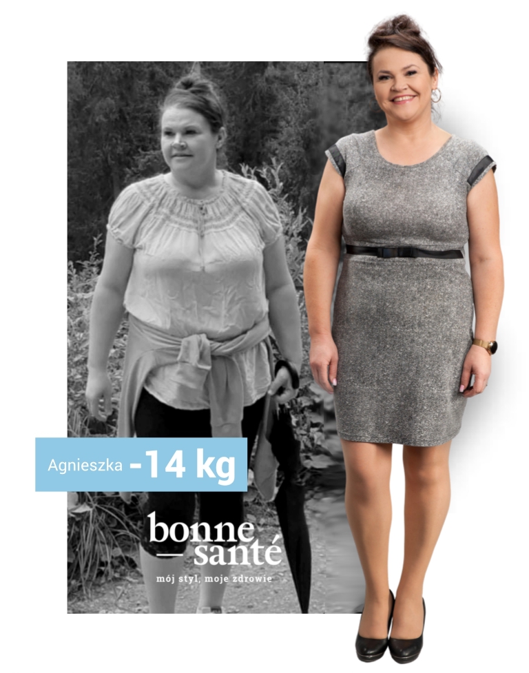 Pani Agnieszka jest doskonałym przykładem dla osób, które chcą schudnąć, ale boją się spróbować. Często odkładają decyzję o zmianie stylu życia na jutro, za miesiąc, czy za kilka lat. Jak zapewnia dietetyk Anna Pięta: „Współpraca z panią Agnieszką jest prawdziwą przyjemnością. Cenię ją za pozytywne nastawienie i energię, którą zaraża innych. Efekty diety były spektakularne od samego początku i mimo, że nasza współpraca jeszcze się nie zakończyła, w ciągu 5 miesięcy udało jej się zgubić 14 kg, co jest naprawdę świetnym wynikiem. Warto dodać, że pani Agnieszka już teraz motywuje innych i dzięki niej kilka osób również postanowiło zawalczyć o siebie i rozpoczęli kurację w Bonne Santé.”